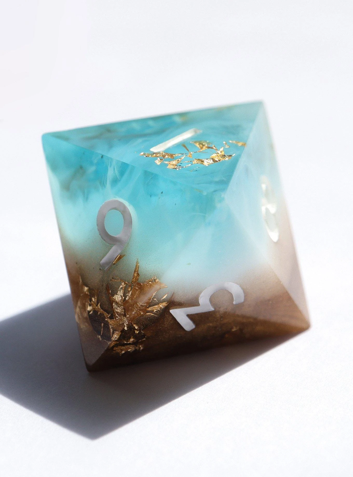 A blue, white, and brown set with gold foil accents, reminiscent of an ocean beach, waves washing up treasure on the shore. This set includes one D4, D6, D8, D10, D%, D12, and D20.