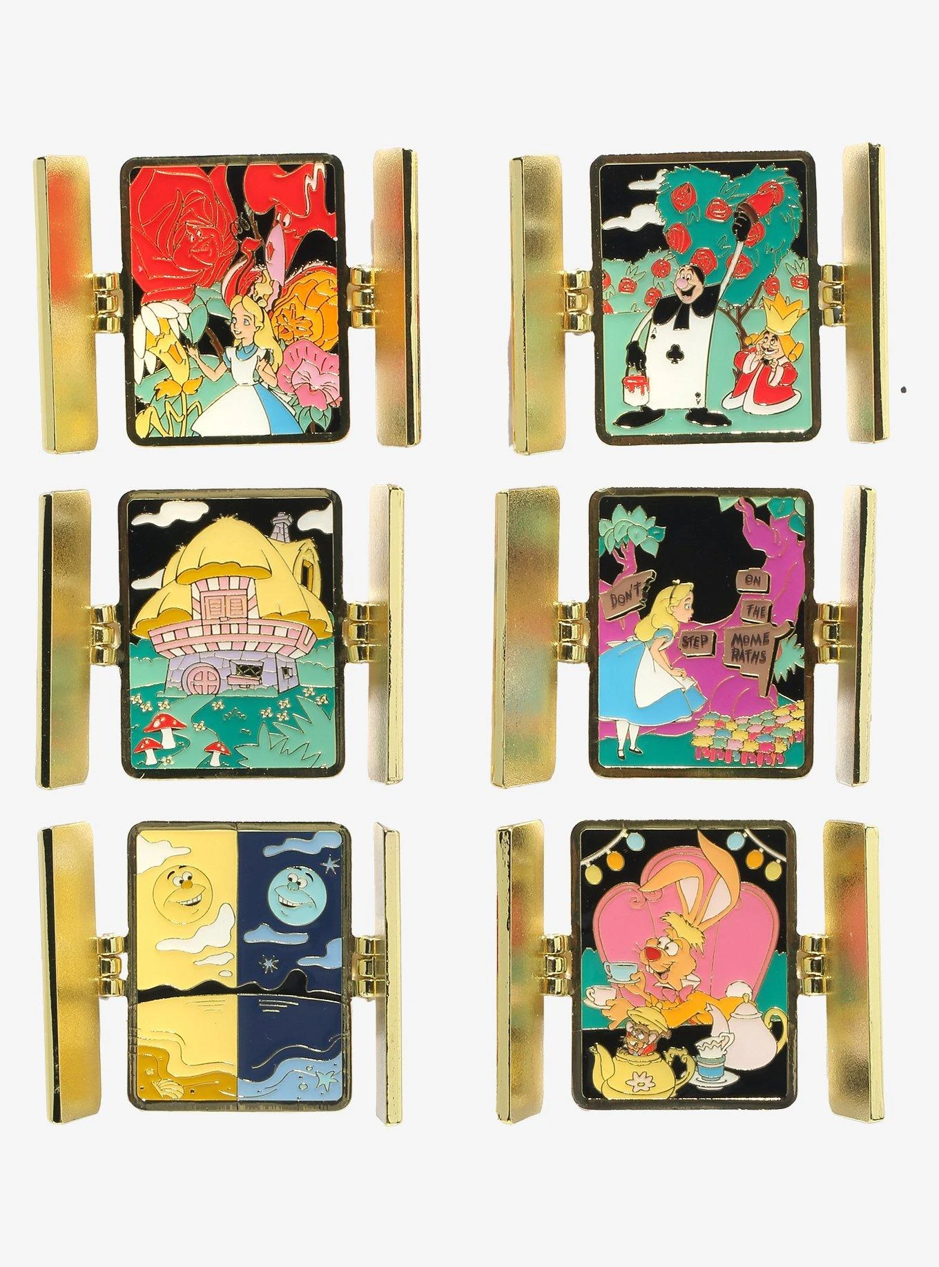 Alice in Wonderland blind box enamel pins! Featuring characters on playing cards, each pin opens to reveal a scene from the film. Which one will you get? It’s a surprise!
